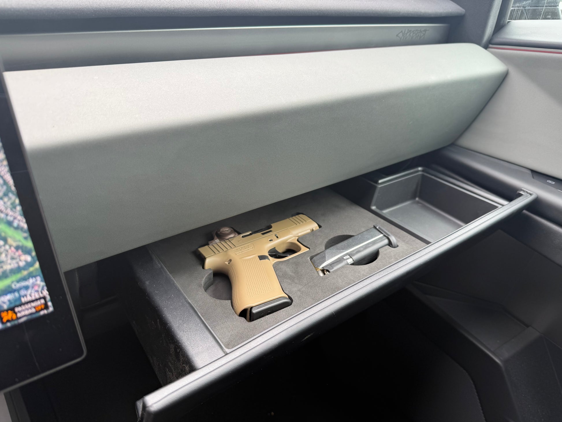 Tell us your make and model, if you're running a red dot, light, or threaded barrel, what size spare mag and we'll custom cut for your setup. Be specific and give exact models of all accessories. We can custom cut for anything you need, keeping your firearm or other valuables accessible, yet secured away from children or other guests with the PIN to Open glovebox.